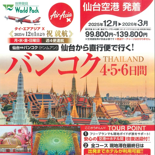 2025年12月1日より、タイ・エアアジアXの直行便が、仙台空港からバン…