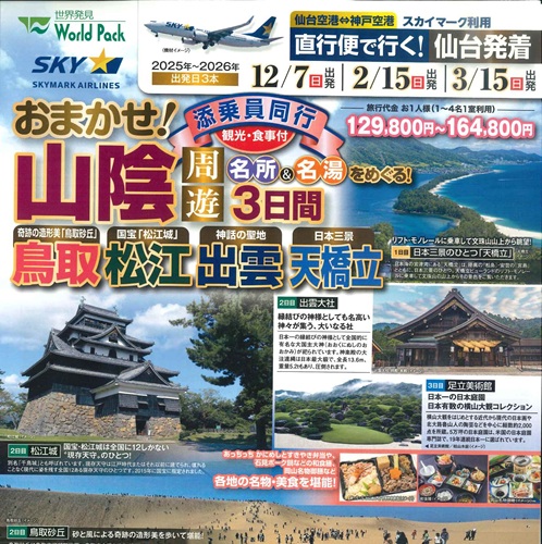 【仙台発着】〈ツアー・ウェーブ〉おまかせ!山陰周…