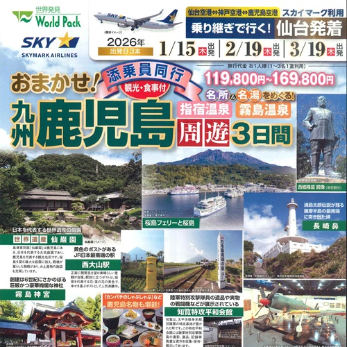 【仙台発着】〈ツアー・ウェーブ〉おまかせ!鹿児島…