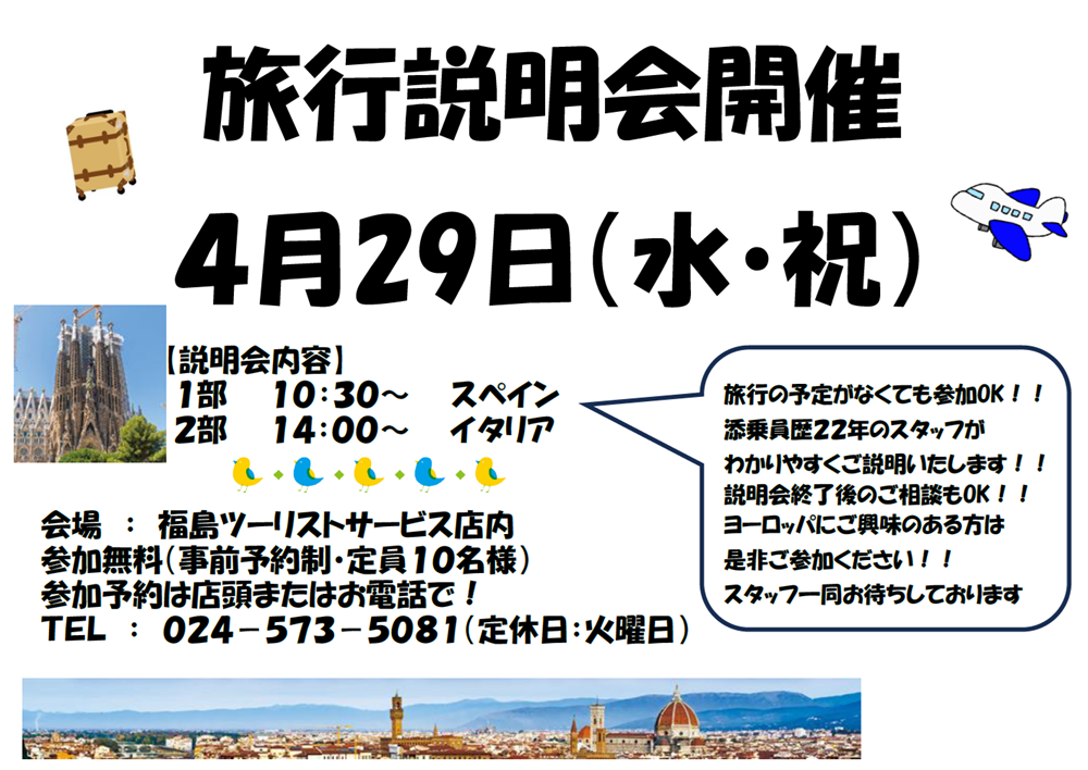 2026.03.03 4月29日(水・祝)海外旅行説明会 開催のお知らせ NEW お知らせ 最近海外旅行、特にヨーロッパ方面へのお申し込みが増えてまいりました。 そこで、通常は休業日の店舗を利用して、お問い合わせが多いスペイン・イタリアの旅行説明会を開催させていただきます。 皆様のご参加をお待ちしております!