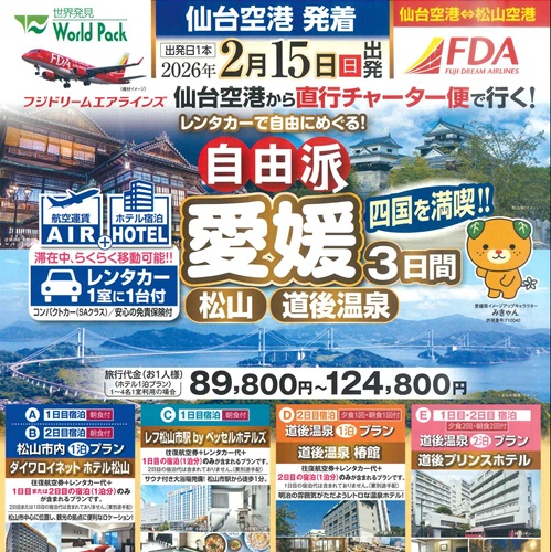 お帰りも松山空港から仙台への直行便、1~2泊分のホテルと3日間のレンタカー付です。