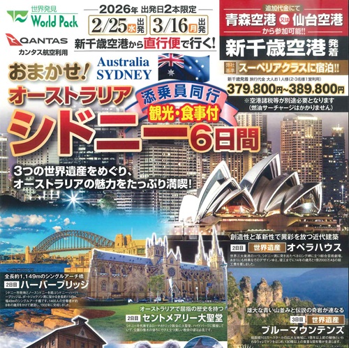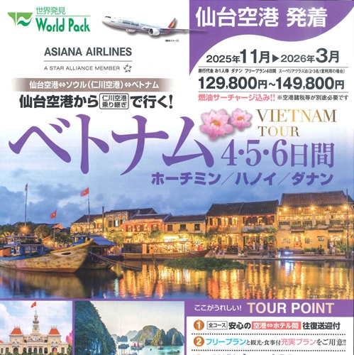 【新千歳空港発着】〈ツアー・ウェーブ〉おまかせ!… シドニーへの直行便は新千歳空港からも出ています! 東京の人混みを避けて、… 【仙台発着】〈ツアー・ウェーブ〉ベトナム4・5・… 寒い日本を飛び出して、ベトナムへの旅に出かけませんか? 直行便に乗るには…